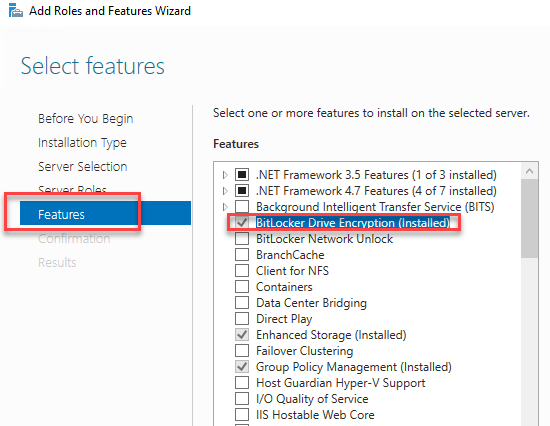 Bu iş için gerekli olan sertifikayı oluşturarak işleme başlıyoruz. Ortamımızda bulunan Certification Authority sunucusuna bağlanıyoruz ve Add Roles and Features sihirbazını kullanarak “Bitlocker Drive Encryption” özelliğini CA sunucusu üzerine yüklüyoruz.