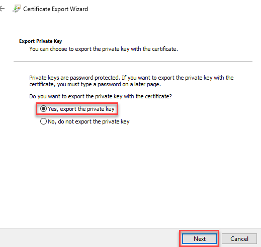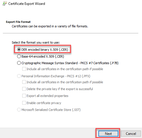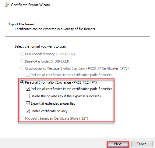 Export sihirbazını 2 kez çalıştıracağız. Çünkü sertifikanın bize hem CER hem de PFX hali gerekiyor.