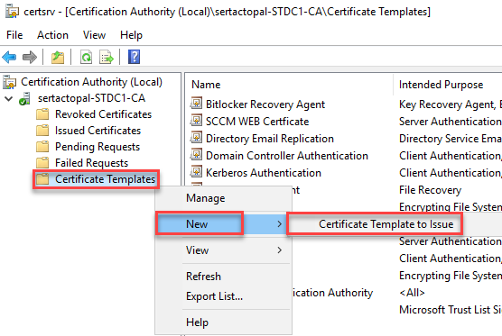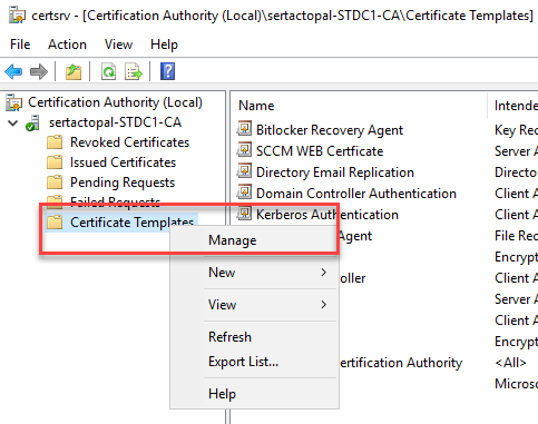Daha sonra Certification Authority Management Consol’u açarak Certificate Template menüsüne sağ tık Manage komutunu veriyoruz.