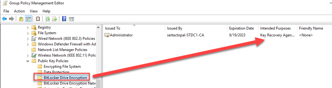 Export işlemleri bittikten sonra elimizdeki sertifikayı Bitlocker ile şifrelenmiş ya da şifrelenecek olan bilgisayarların alabilmesi için bir GPO ile dağıtmamız gerekiyor.