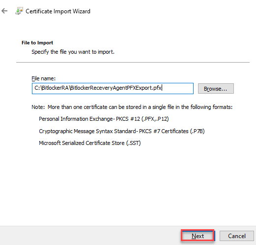 Disk Locked durumda pin’i unuttuk ve Recovery Key’de elimizde yok ya da işe yaramadı. Yazının başında export ettiğimiz sertifikalardan PFX olanını işlemi yapacağımız bilgisayara yüklüyoruz.