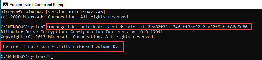 manage-bde -unlock d: -certificate -ct 0ea80f351e746dbf3be92e2ca32f5bbab80c5e86