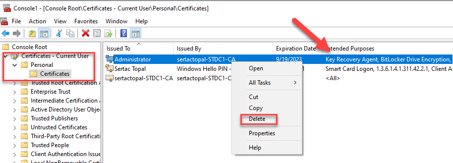• CA üzerinden Export etmiştik hatırlarsanız bu sertifikayı. Haliyle orada da duruyor. İyi bir şekilde saklayacağınıza eminseniz oradan da silebilirsiniz.