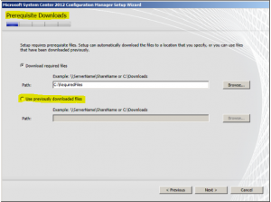 SCCM 2012 kurulumunda setup sihirbazına uyarak devam ettiğinizde yolunuz aşağıdaki ekrana illaki gelecektir. Bu ekranda SCCM2012 ile ilgili kurulum öncesinde gereken Prerequisite diye tabir edilen dosyaların indirilmesi illaki gereklidir. Sebep evde test için olabilir, interneti olmayan kurumlarda kurulum yapmaya çalışmak olabilir ya da bu download işlemini her seferinde beklememek olabilir. Bu tip durumlarda resimdeki gibi …