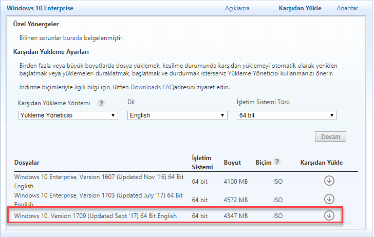 Windows 10 Fall Creators Update olarak geçen Build 1709 sürümü Volume License üzerinden indirilebilir durumda.